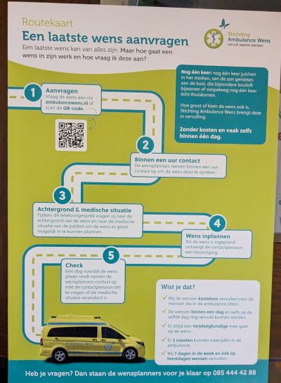 Sinds 2007 vervult Stichting Ambulance Wens laatste wensen van (terminale) niet meer mobiele patiënten. Wat begon met één wens per keer is uitgegroeid tot dagelijks 7 à 10 wensen, verspreid door heel Nederland en soms zelfs over de grens.